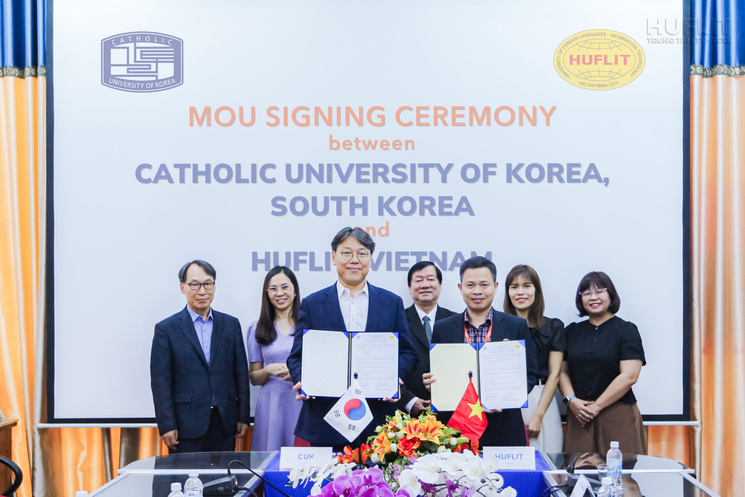 Lễ ký kết Biên bản ghi nhớ giữa HUFLIT và Đại học Công giáo Hàn Quốc với sự tham gia của Ông Koo Bon Man – Giám đốc tài chính kế hoạch CUK và PGS.TS. Nguyễn Ngọc Vũ – Phó Hiệu trưởng HUFLIT.