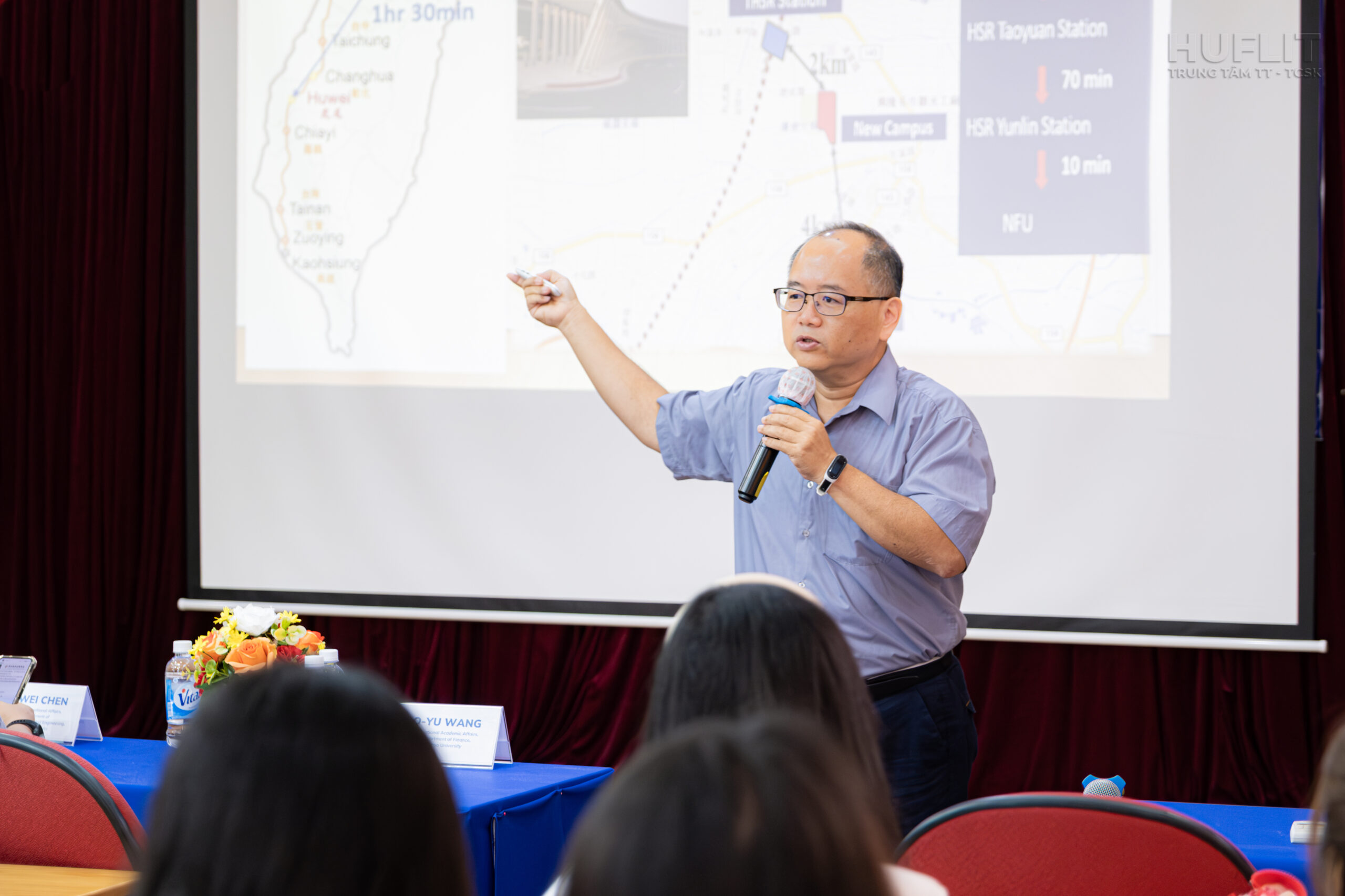 Sau buổi ký kết, TS. Jo-Yu Wang – Phụ trách Bộ phận Học thuật quốc tế, đồng thời là giáo sư của Khoa Tài chính NFU đã có buổi báo cáo chuyên đề về văn hóa doanh nghiệp Đài Loan cho hơn 100 bạn sinh viên các khoa Ngoại ngữ, Quản trị kinh doanh, Công nghệ thông tin và Kinh tế – Tài chính. Thông qua bài chia sẻ, thầy còn lồng ghép các thông tin về Đài Loan nói chung và NFU nói riêng dành cho các bạn sinh viên có nguyện vọng du học.
