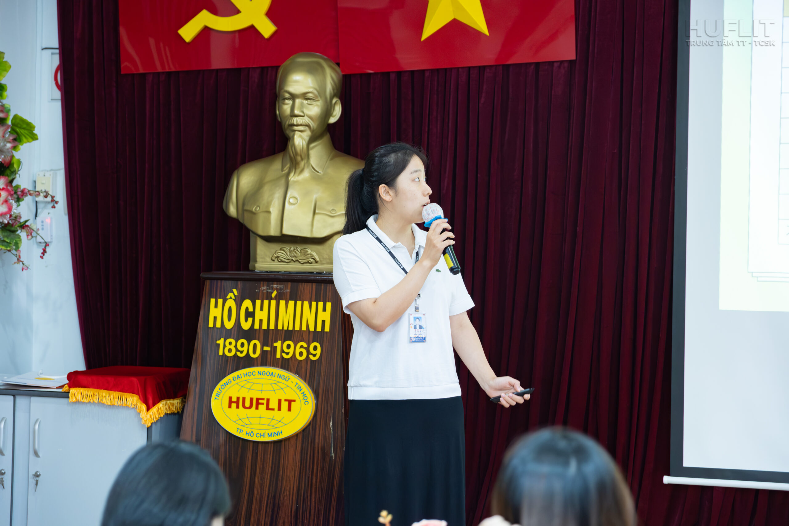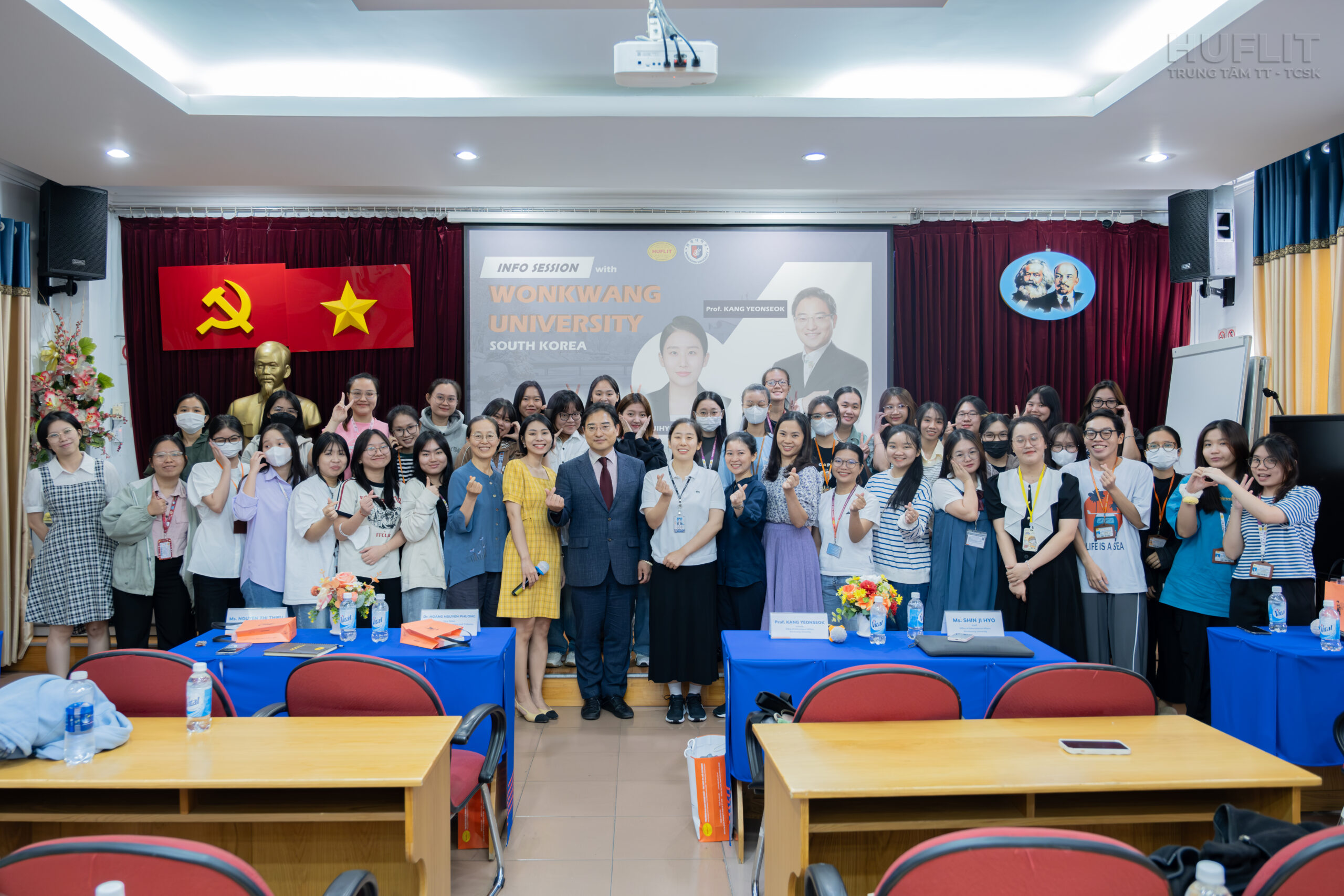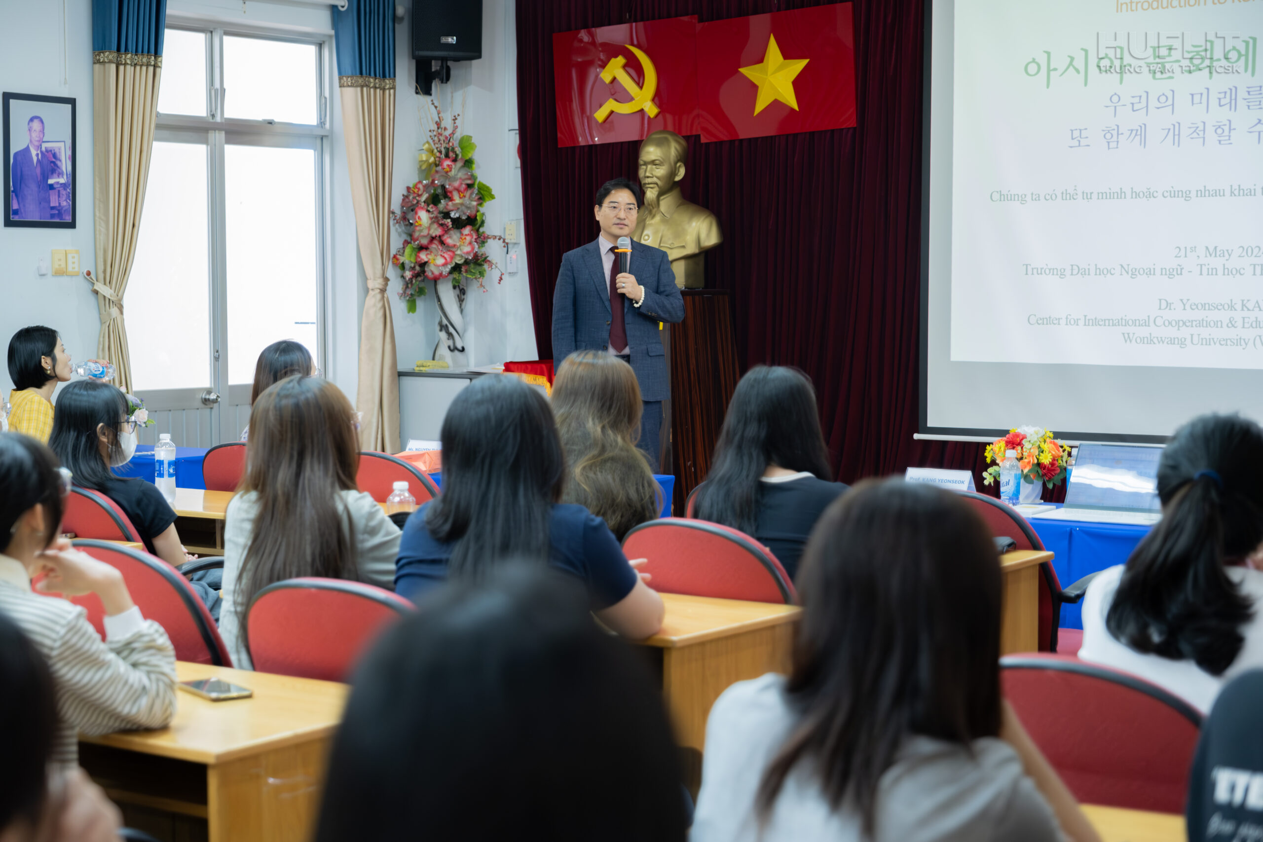 Tham dự buổi chia sẻ lần này, đại diện WKU cùng chia sẻ với các sinh viên là GS. Kang Yeon Seok – Trưởng phòng Hợp tác quốc tế và Cô Shin Jihyo – Nhân viên Phòng Hợp tác quốc tế. Về phía HUFLIT, có sự hiện diện của ThS. Nguyễn Thị Thiều – Trưởng phòng đối ngoại và TS. Hoàng Nguyên Phương – Phó trưởng khoa Ngôn ngữ và Văn hóa Phương Đông cùng gần 100 sinh viên chuyên ngành Hàn Quốc học và ngành Ngôn ngữ Hàn Quốc, khoa Ngôn ngữ và Văn hóa phương Đông.
