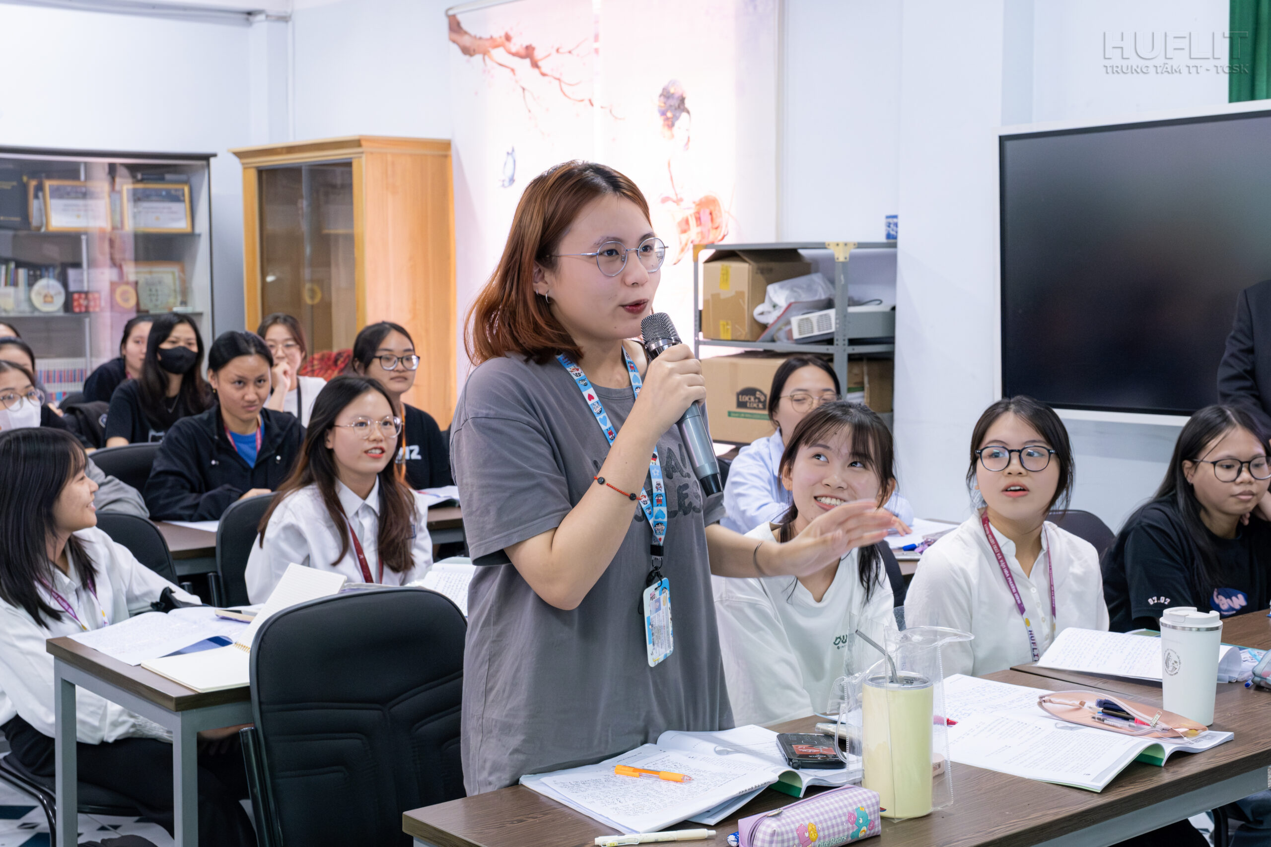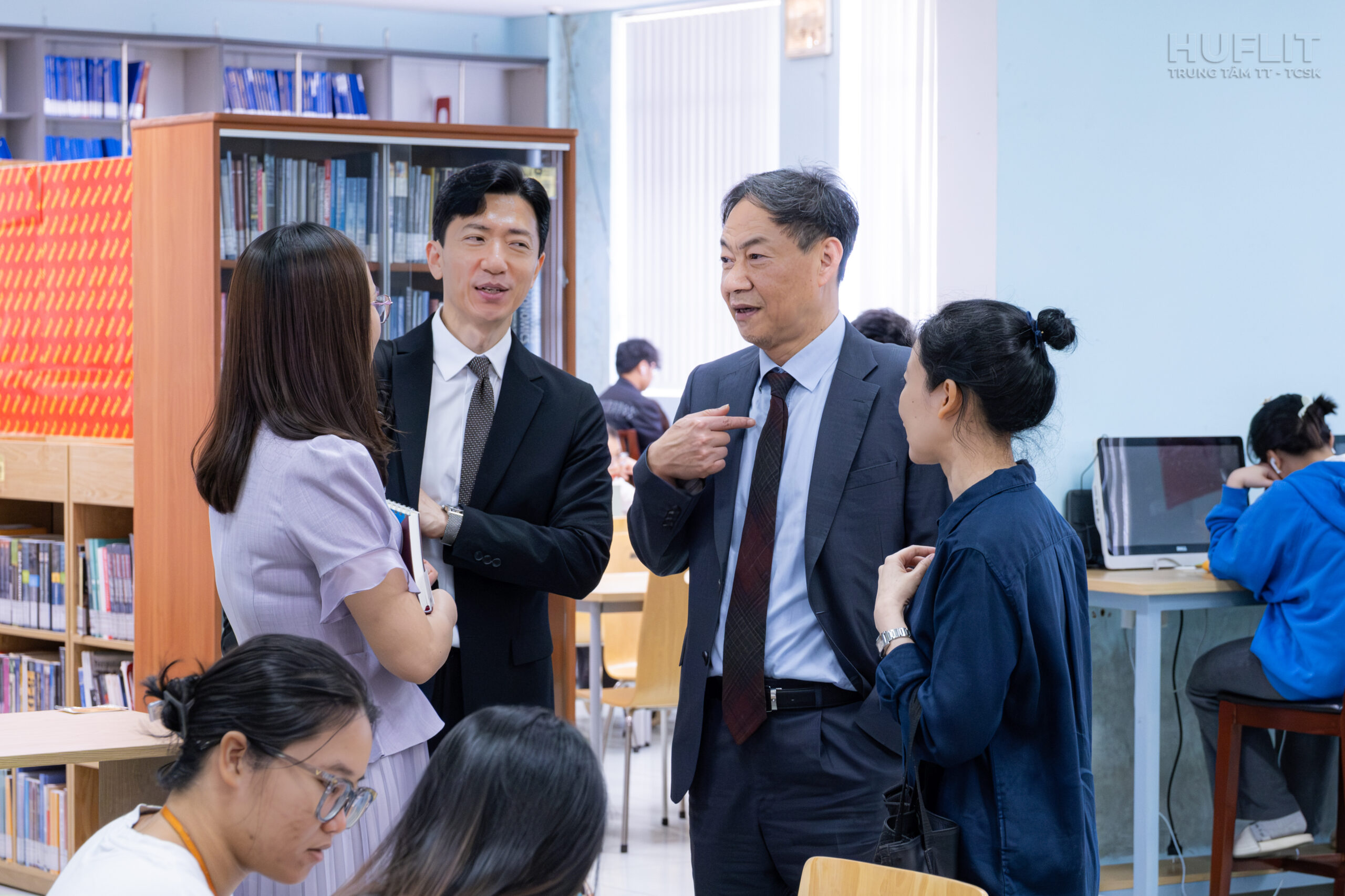 Sau cuộc họp, đoàn trường PCU còn đi tham quan Thư viện và giao lưu với sinh viên năm 2 chuyên ngành ngôn ngữ Hàn. Các bạn rất hào hứng đặt các câu hỏi về thông tin học tập tại PCU, cũng như cuộc sống tại Hàn Quốc và nhưng chi tiết khác liên quan. Hy vọng buổi giao lưu cùng sinh viên HUFLIT tuy ngắn nhưng có thể phần nào vun đắp cho ước mơ du học tại “xứ sở kim chi” của các sinh viên Bộ môn tiếng Hàn.