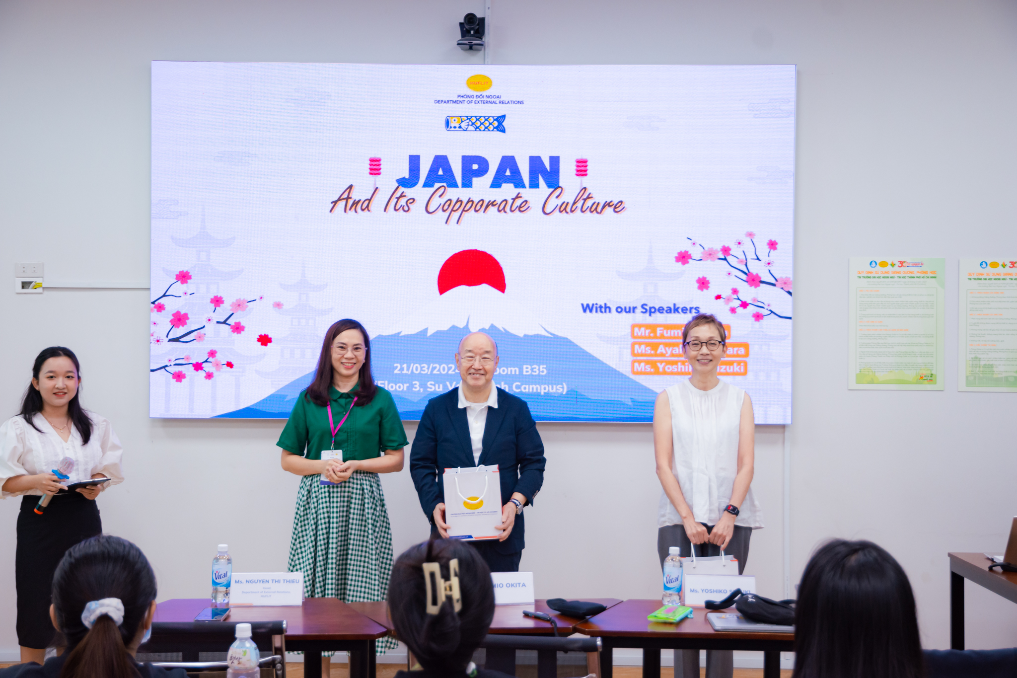 Sau 4 năm được thực hiện dưới hình thức trực tuyến, năm 2024 đánh dấu lần đầu tiên lớp học “Văn hóa doanh nghiệp Nhật Bản” được tổ chức trực tiếp tại HUFLIT với sự đồng hành của 2 chuyên gia kinh tế đến từ Nhật Bản gồm Thầy Fumio Okita và Cô Ayaka Fujiwara.