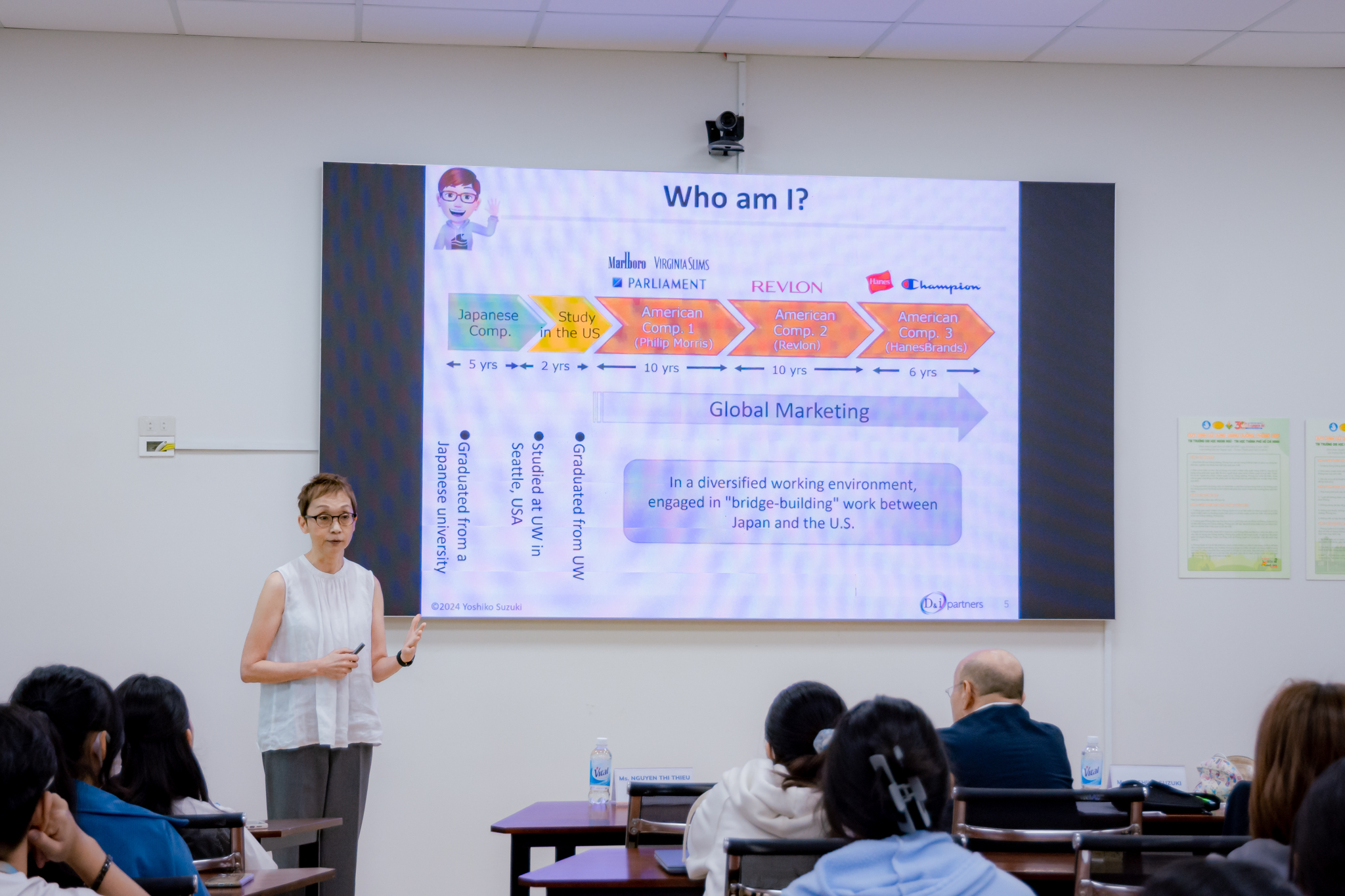 Còn ở phần “Marketing quốc tế”, cô Suzuki đã giúp sinh viên phân biệt được kinh doanh quốc tế và kinh doanh trong nước, nắm bắt những điều quan trọng nhất về tiếp thị và hiểu rõ tầm quan trọng của việc xây dựng “cầu nối” (bridge-building) giữa các quốc gia cũng như những mấu chốt của một chiến lược kinh doanh quốc tế thành công.