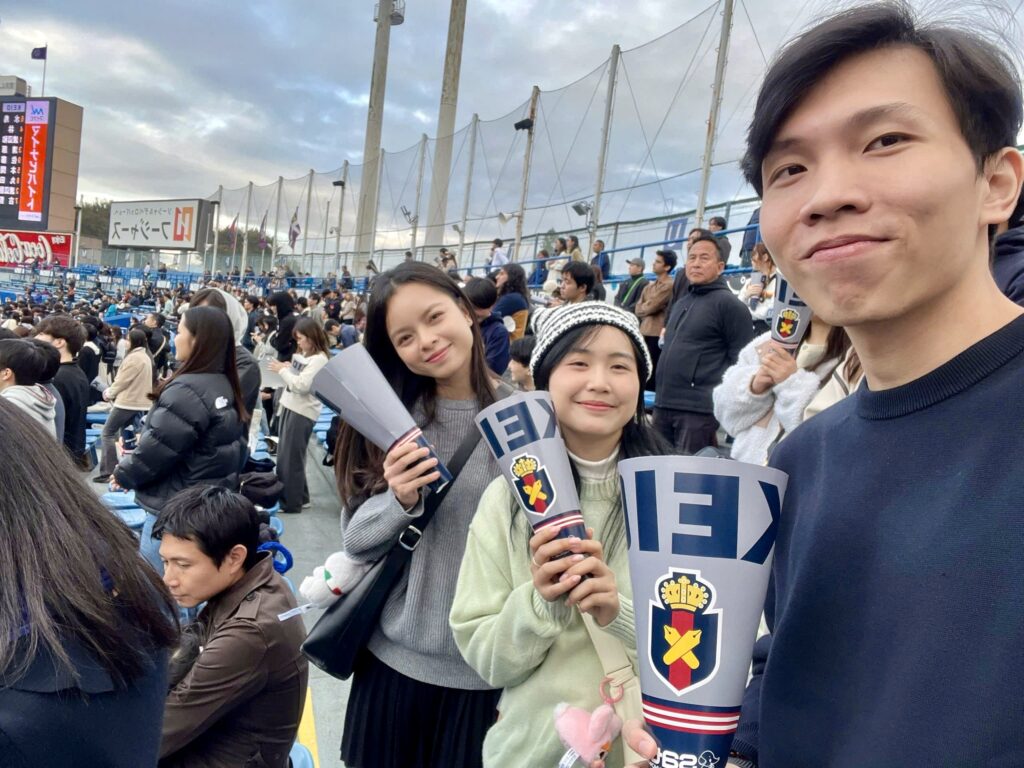 Minh Huy hòa mình vào bầu không khí sôi động khi cổ vũ bóng chày tại Đại học Keio, Nhật Bản