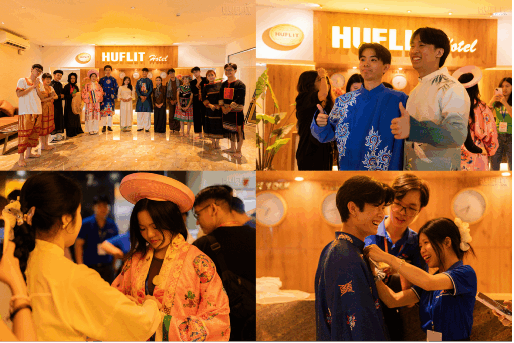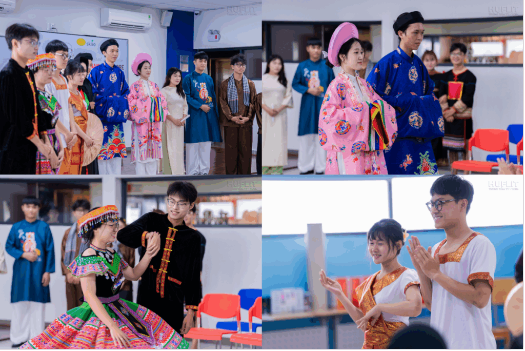 Với phần thuyết minh dí dỏm và giàu hình ảnh của HUFLITers, mỗi bộ áo dài, váy dân tộc không chỉ là trang phục mà trở thành câu chuyện sống động về văn hóa Việt Nam.