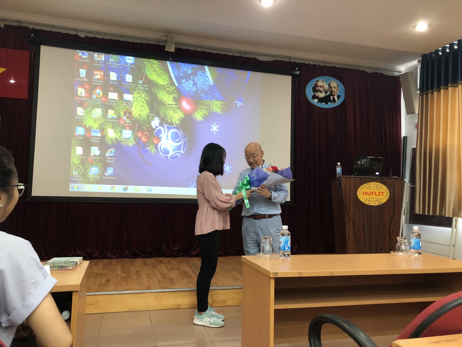 Cuối buổi workshop, HUFLIT đã gửi đến GS. Okita đoá hoa tươi thắm thay lời cám ơn cho những kiến thức bổ ích mà thầy đã truyền đạt. Đây sẽ là hành trang quý báu giúp các cử nhân tương lai sẵn sàng tham gia môi trường doanh nghiệp đa quốc gia, cụ thể là tại các công ty, tập đoàn Nhật Bản đầy năng động, hiện đại nhưng không kém phần kỷ luật.